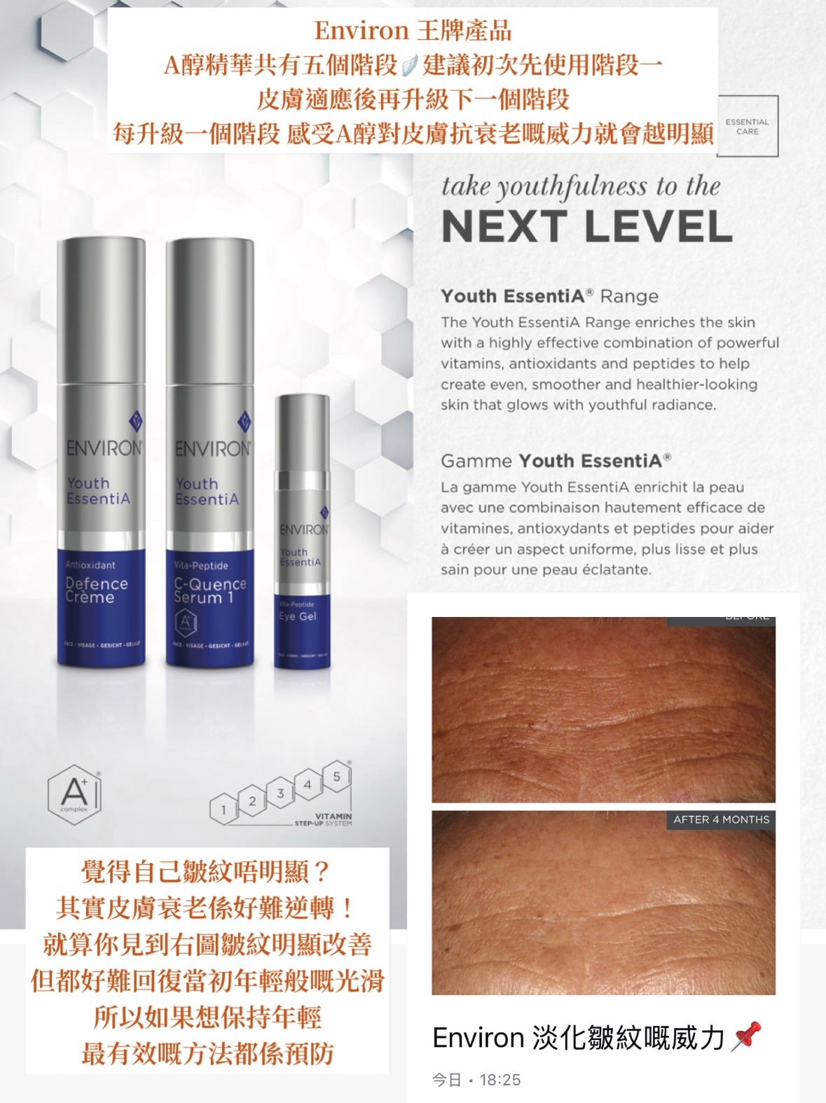 Environ 的核心價值 𝙎𝙩𝙖𝙧𝙩 𝙡𝙤𝙬 𝙜𝙤 𝙨𝙡𝙤𝙬!效果會比市面上維他命A成份精華來得比較慢因為前期使用劑量極低,目的係幫助皮膚適應有效大大避免使用維他命A導致的紅腫痕癢、甩皮問題