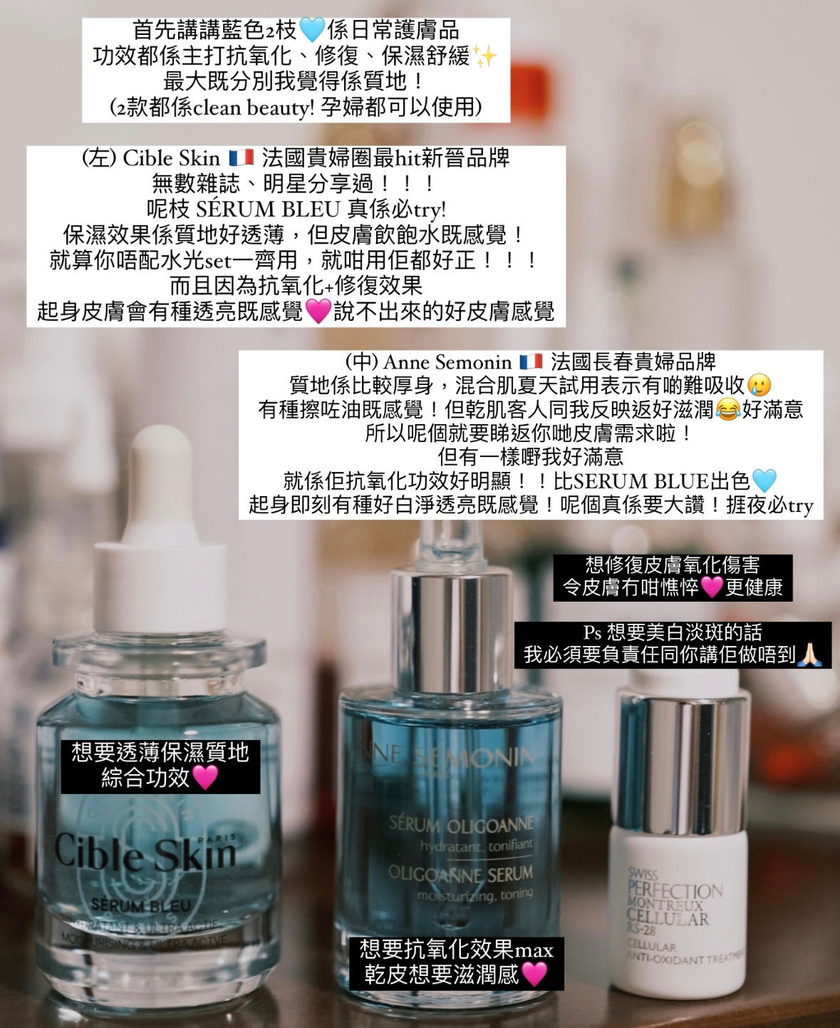 Serum Bleu🩵 集抗氧化+保濕於一身,可以話係基本上滿足咗9成女士每日護膚所需😝 乾肌混合肌油性皮膚都可以使用!